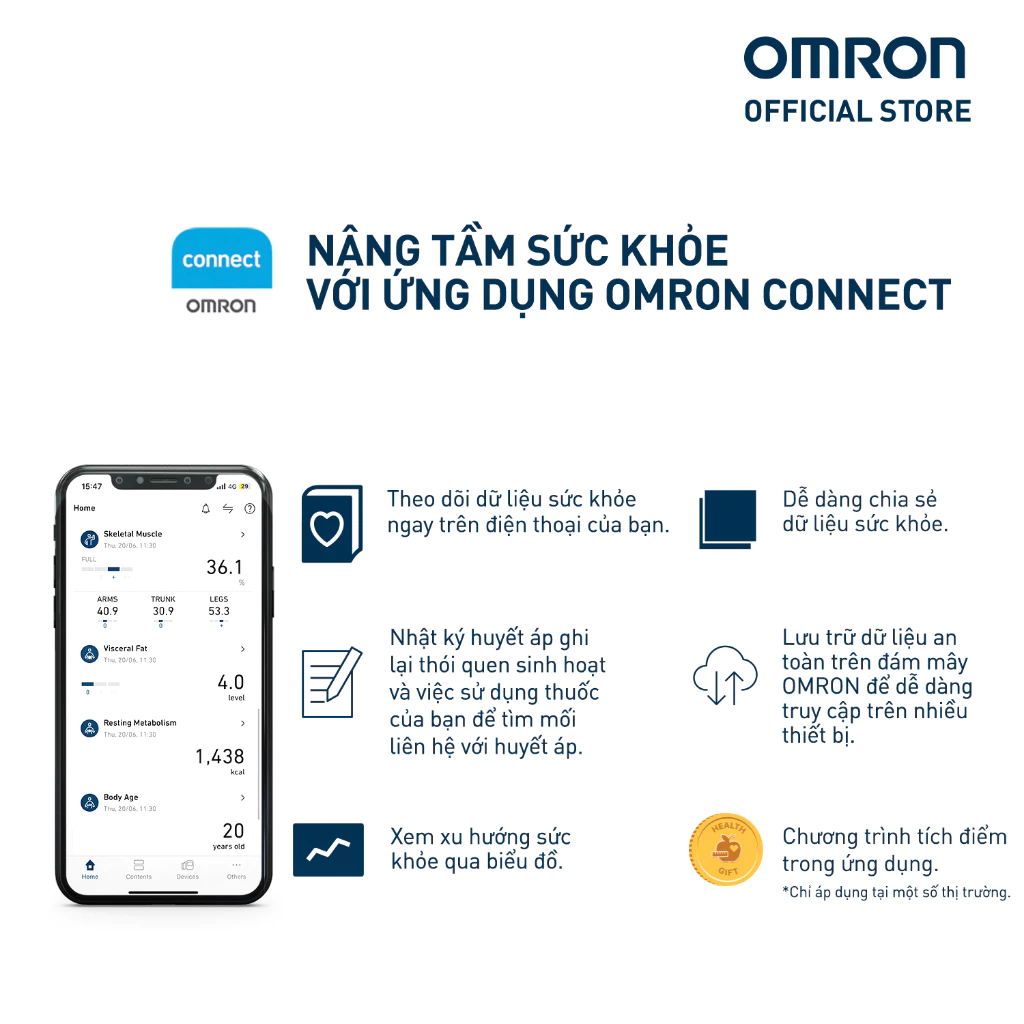 - Kết nối Bluetooth & Omron Connect: Dữ liệu tự động truyền đến điện thoại thông minh, lưu trữ lịch sử sức khỏe, hiển thị biểu đồ xu hướng rõ ràng.