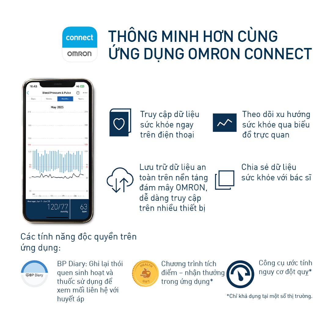 - Kết nối thông minh & Quản lý dữ liệu: Kết nối Bluetooth với ứng dụng OMRON Connect trên điện thoại, cho phép lưu trữ, theo dõi và phân tích xu hướng các chỉ số sức khỏe theo thời gian.