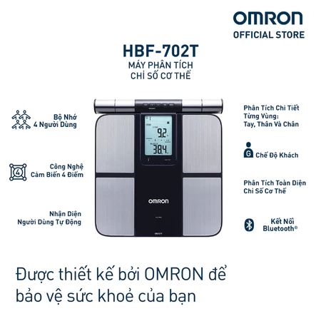 - Công nghệ 8 điện cực chính xác cao: Sử dụng 4 cảm biến ở tay và 4 cảm biến ở chân, HBF-702T đo chính xác các chỉ số như tỷ lệ mỡ cơ thể, mỡ nội tạng, cơ xương, tuổi cơ thể, chuyển hóa cơ bản.