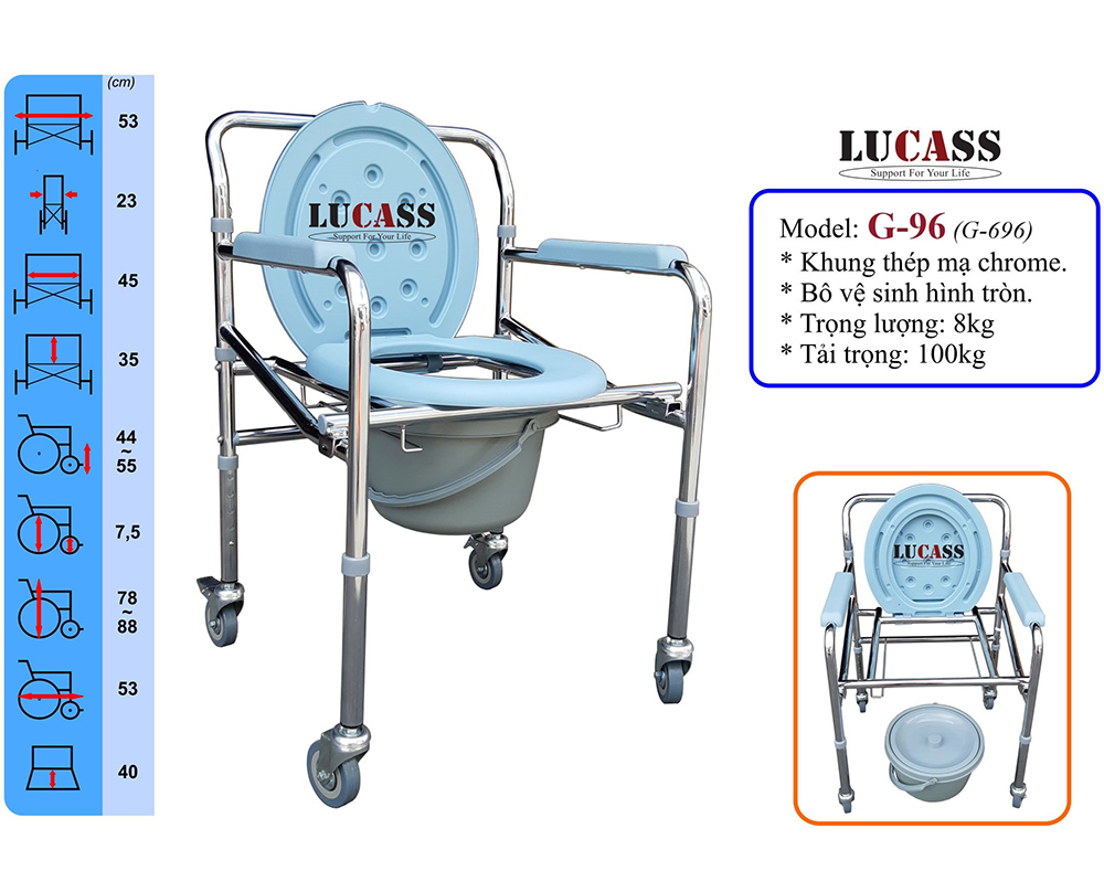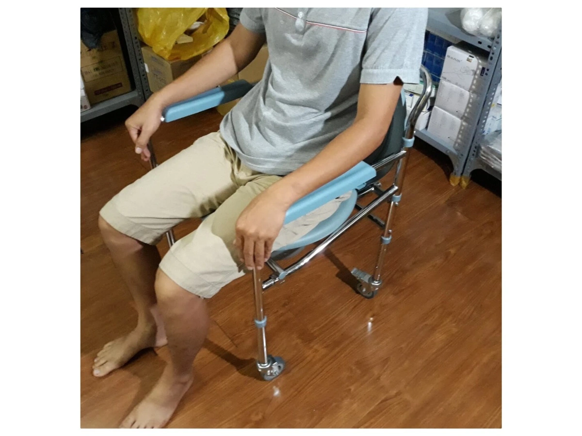 - Đa chức năng & Di động: Có bánh xe giúp di chuyển người bệnh như xe lăn, dễ dàng đẩy vào bồn cầu. Có thể gấp gọn khi không sử dụng.
