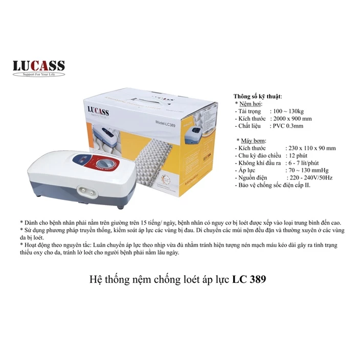 - Cơ chế chống loét chủ động: Sử dụng máy bơm hơi để luân chuyển dòng khí liên tục từ múi này sang múi khác (chu kỳ khoảng 6-9 phút/lần), hoạt động như một máy massage, giảm thiểu tối đa áp lực lên bề mặt da, ngăn ngừa và hỗ trợ điều trị lở loét (loét tỳ đè).