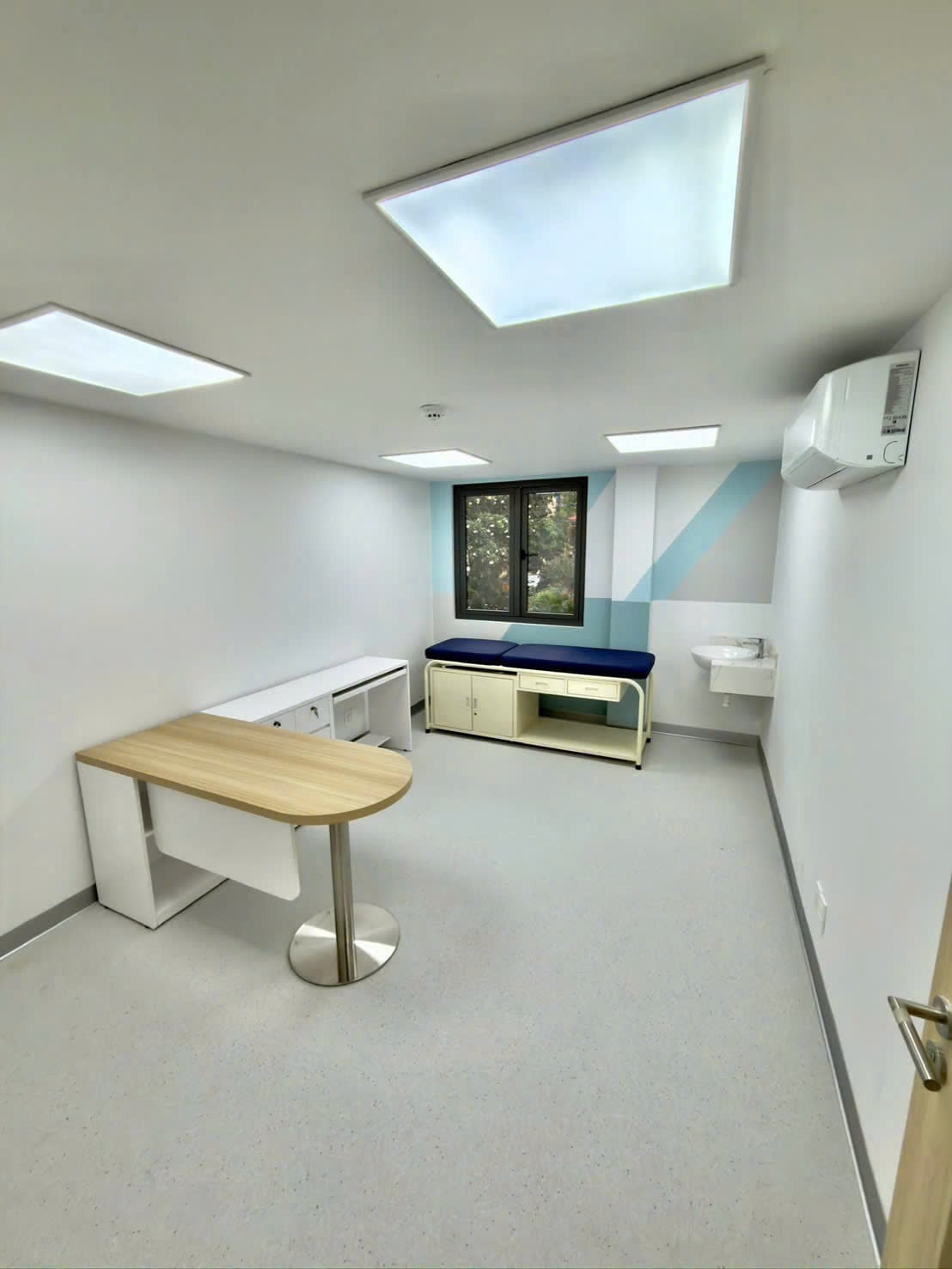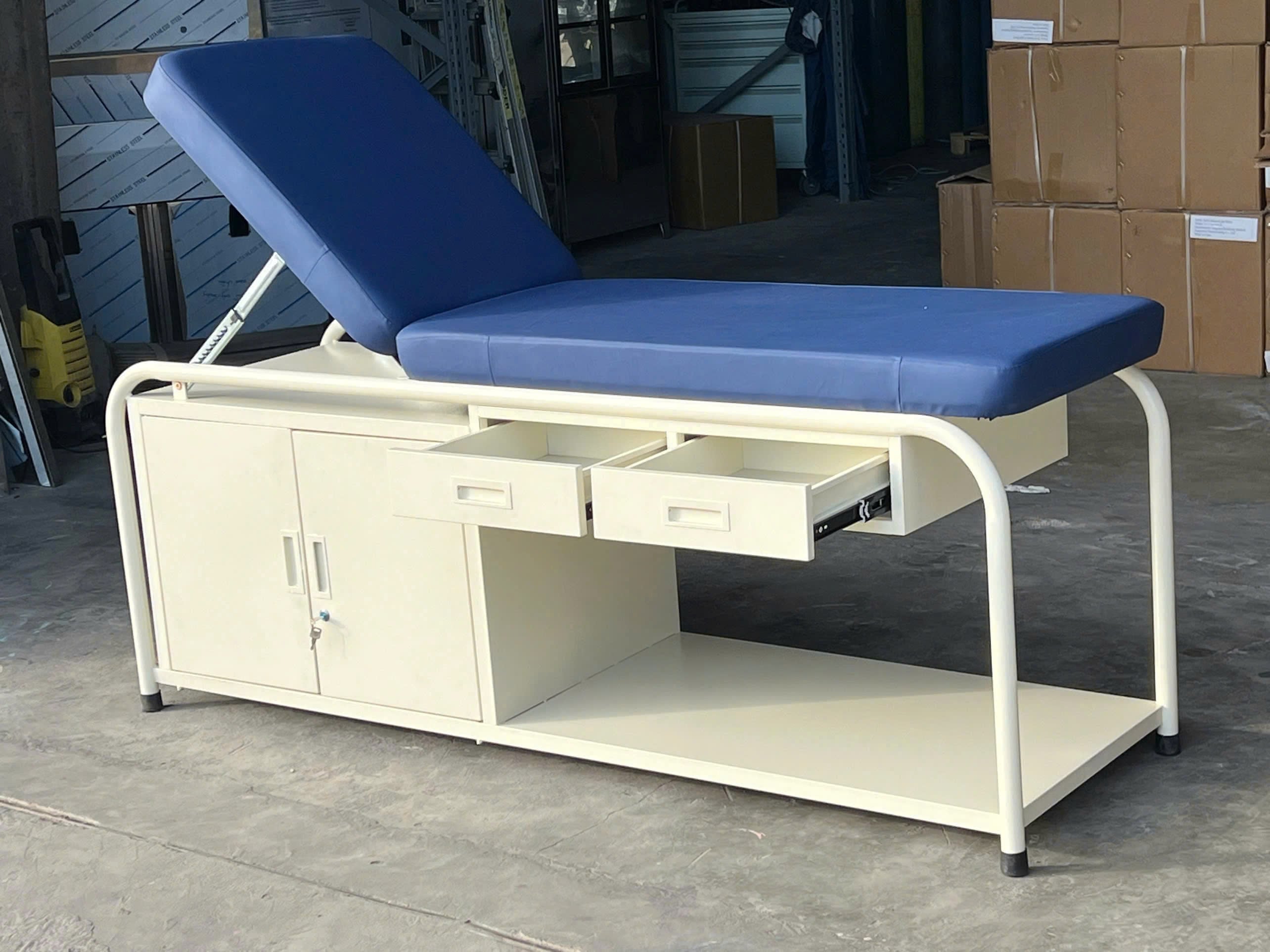 - Thiết kế "All-in-one" thông minh: Sự kết hợp hoàn hảo giữa giường khám và hệ thống lưu trữ (ngăn kéo, tủ khóa, kệ hở) giúp tối ưu hóa diện tích và giữ cho phòng khám luôn gọn gàng, chuyên nghiệp.