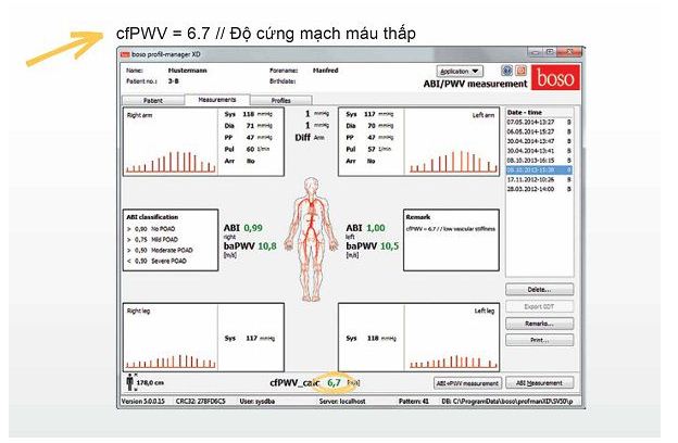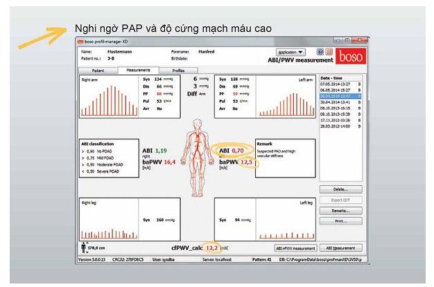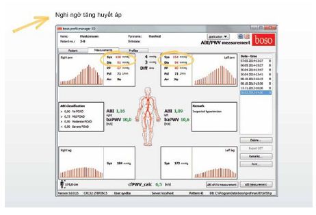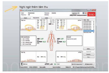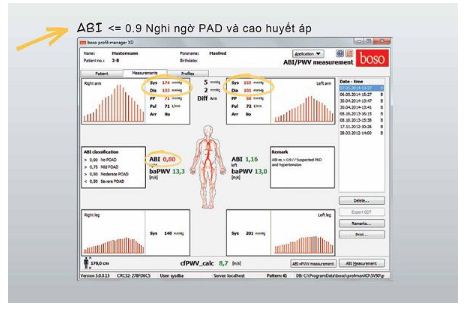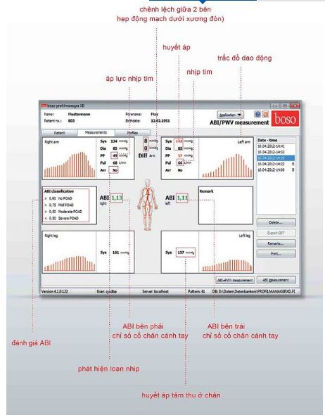 Những phương pháp kiểm tra trước đo không đưa ra được đánh giá tự động. Hệ thống Boso ABI sử dụng một phần mềm cung cấp một số tính năng hữu ích. Sau khi thực hiện đo, kết quả sẽ được tự động phân bố cho những mục lựa chọn. Hệ thống còn đo các thông số tim mạch quan trọng khách ngoài chỉ số ABI và hiển thị cho tất cả dữ liệu. Giao diện GDT cho phép xuất dữ liệu tới hệ thống DTP của bác sĩ.