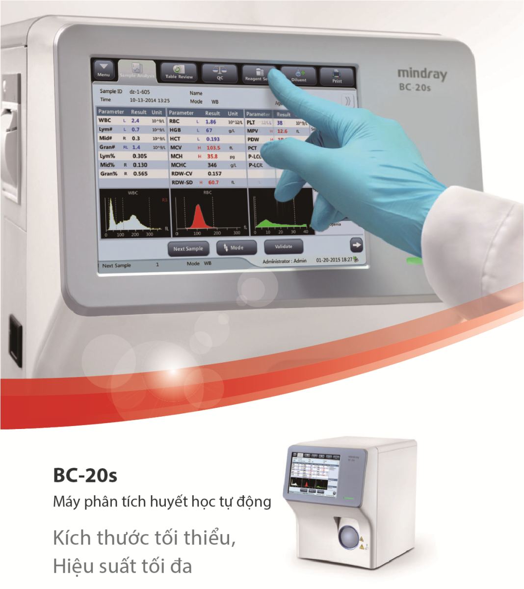 19 thông số: WBC, Lymth#, Mid#, Gran#, Lymth%, Mid%, Gran%, RBC, HGB, HCT, MCV, MCH, MCHC, RDW-CV, RDW-SD, PLT, MPV, PDW, PCT