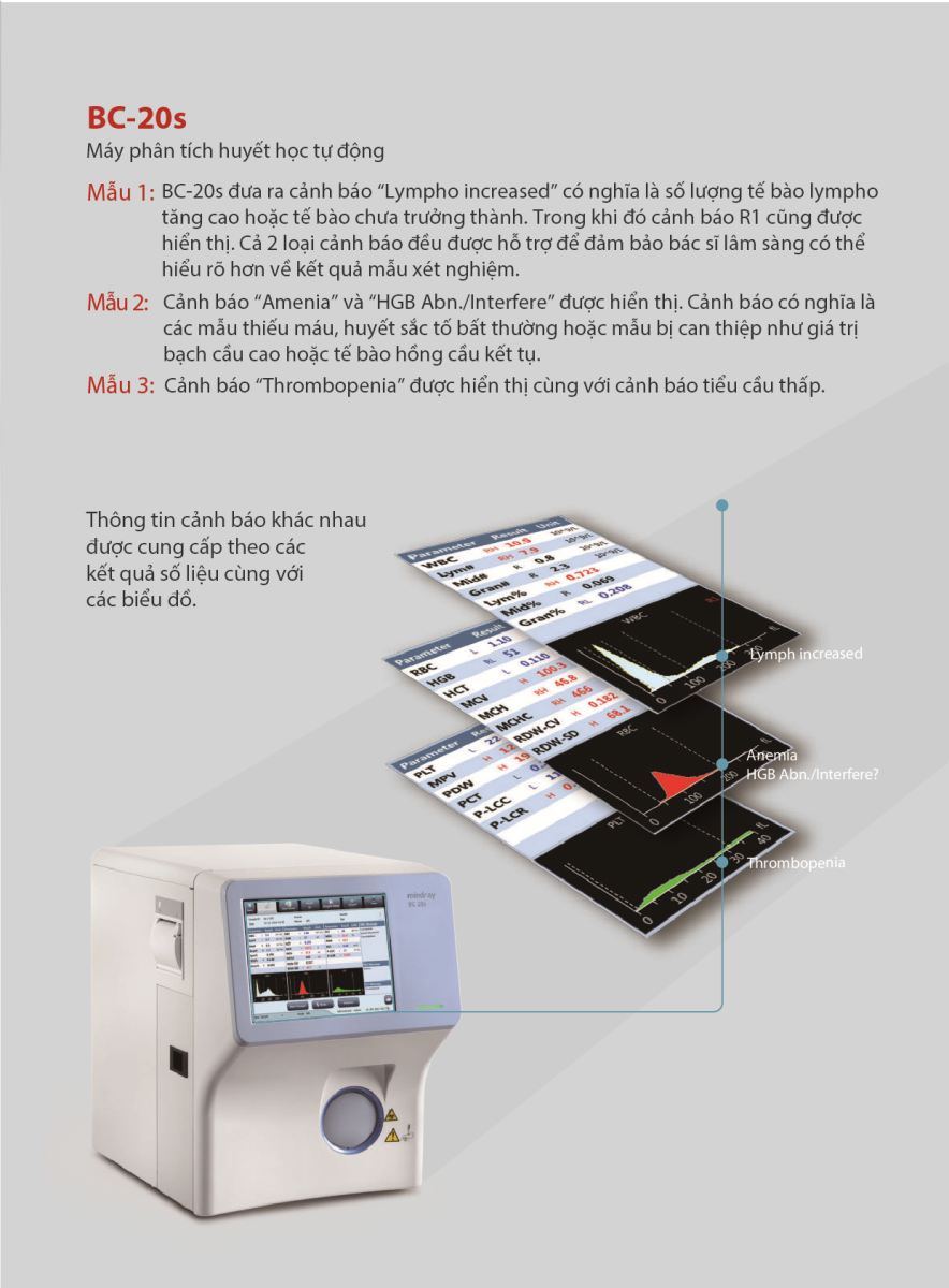 Có các cảnh báo chi tiết bất thường WBC, RBC và PLT dựa trên các kết quả số liệu cùng với các biểu đồ