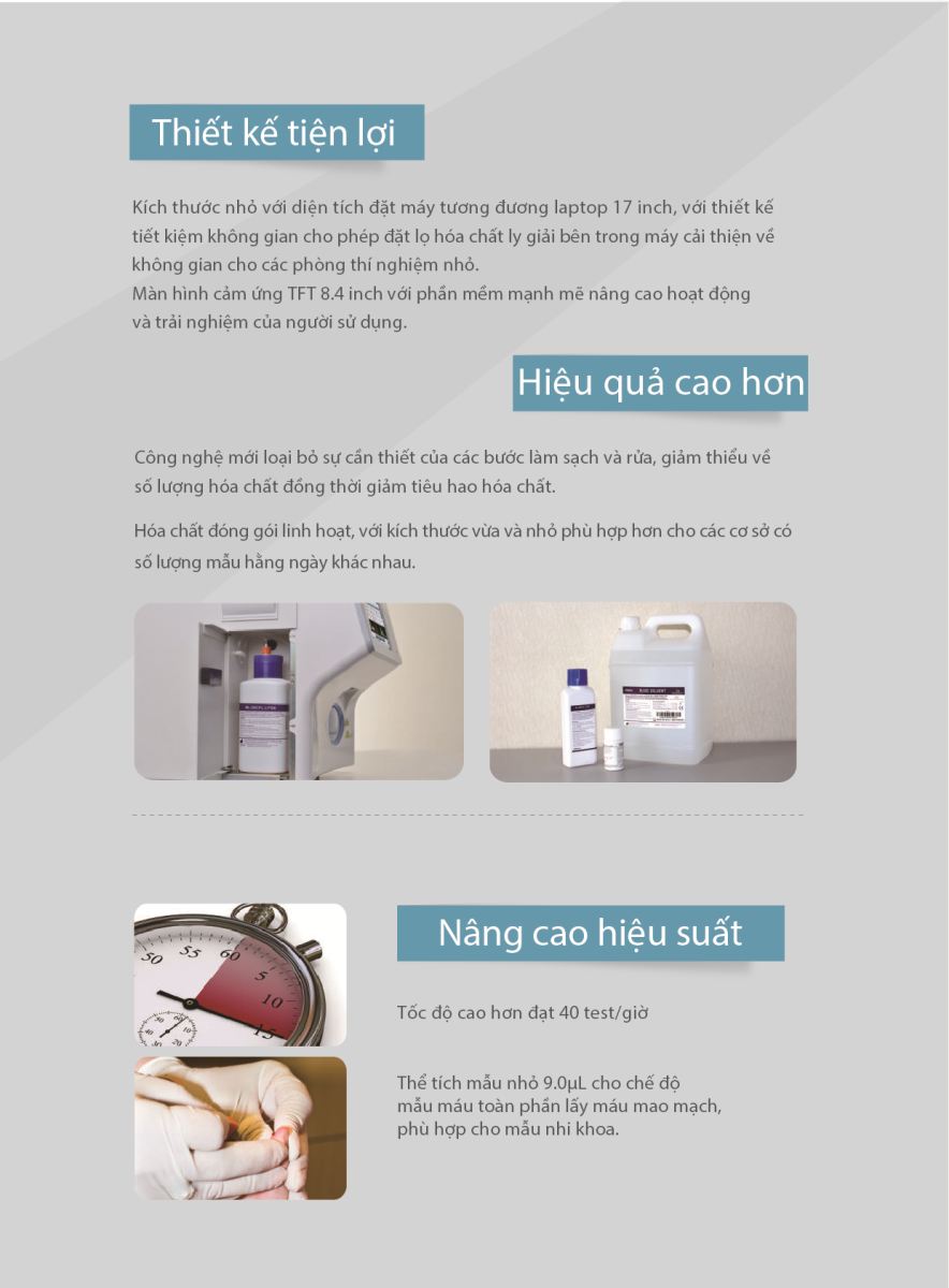 Sử dụng thể tích nhỏ máu mao mạch 9µL, phù hợp cho mẫu nhi khoa
