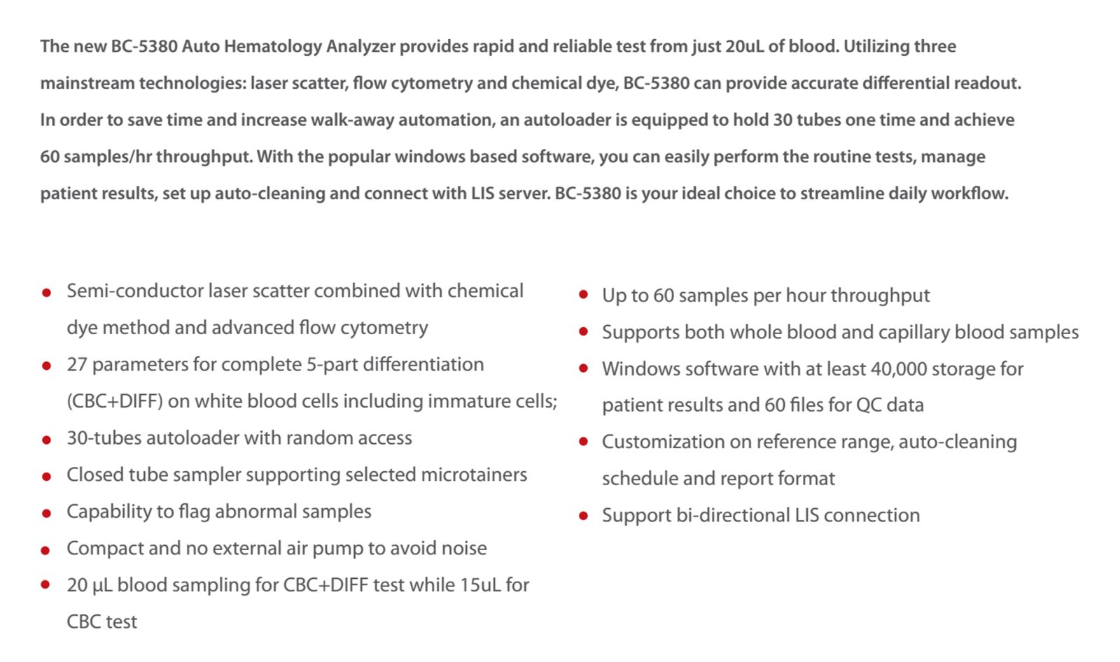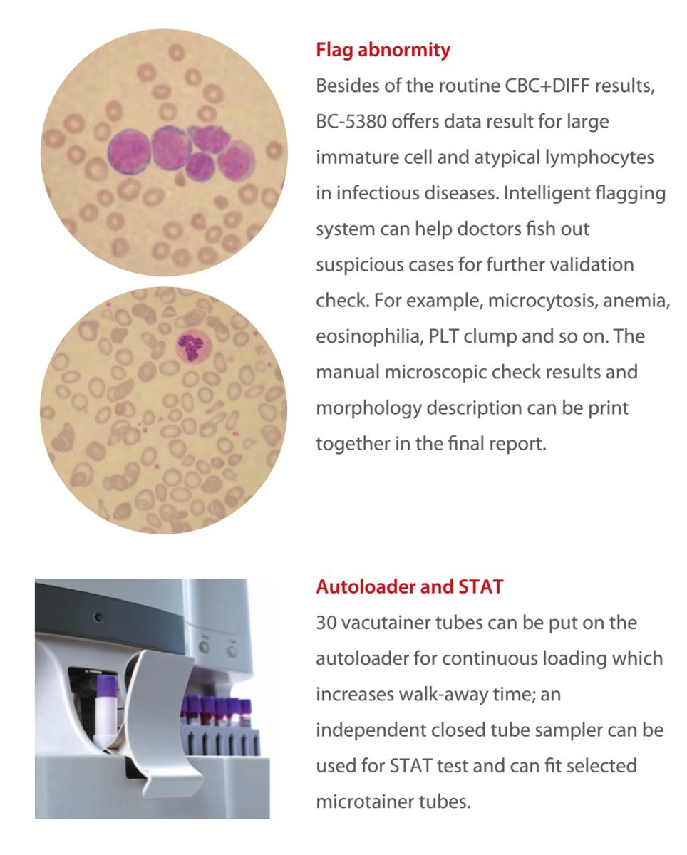 {C}·{C}Phân tích 5 thành phần bạch cầu, 27 thông số, một biểu đồ tán xạ và ba đồ thị. {C}·{C}Đếm dòng tế bào bằng công nghệ lase bán dẫn kết hợp với phương pháp nhuộm hóa học {C}·{C}Nhỏ gọn, mạnh mẽ, giá cả phải chăng {C}·{C}Thể tích mẫu chỉ cần 20ml {C}·{C}30 ống tự động chuyển với truy cập ngẫu nhiên {C}·{C}Đóng ống với mẫu STAT {C}·{C}Tốc độ phân tích: 60 mẫu/giờ. {C}·{C}2 chế độ đếm: Máu toàn phần và pha loãng {C}·{C}Có khả năng đánh dấu các mẫu bất thường {C}·{C}Bộ nhớ trong với dung lượng lớn, có thể lưu được 40.000 kết quả (bao gồm cả biểu đồ). |