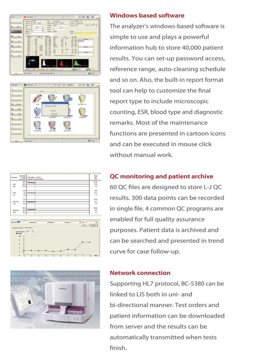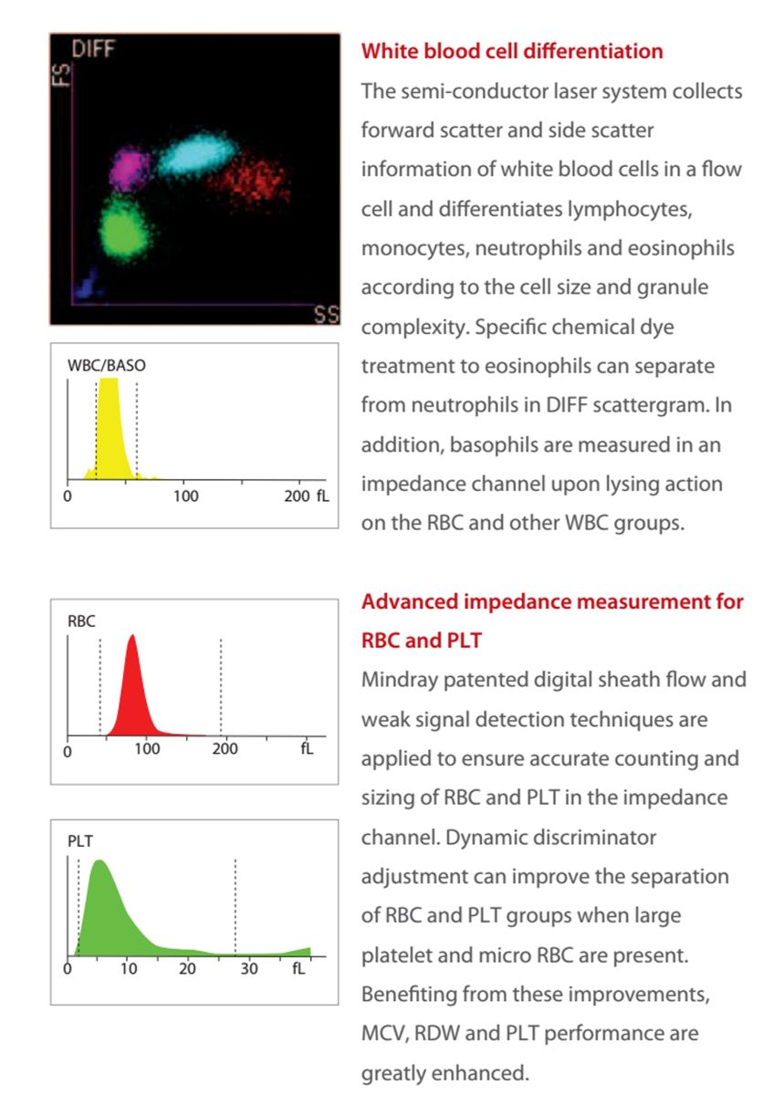 {C}·{C}Đếm theo phương pháp trở kháng với WBC, RBC, PLT và theo phương pháp không cyanide cho Hemoglobin, phân tích dòng tế bào (FCM), tán xạ lase bán dẫn, nhuộm hóa học, kênh Baso độc lập. |