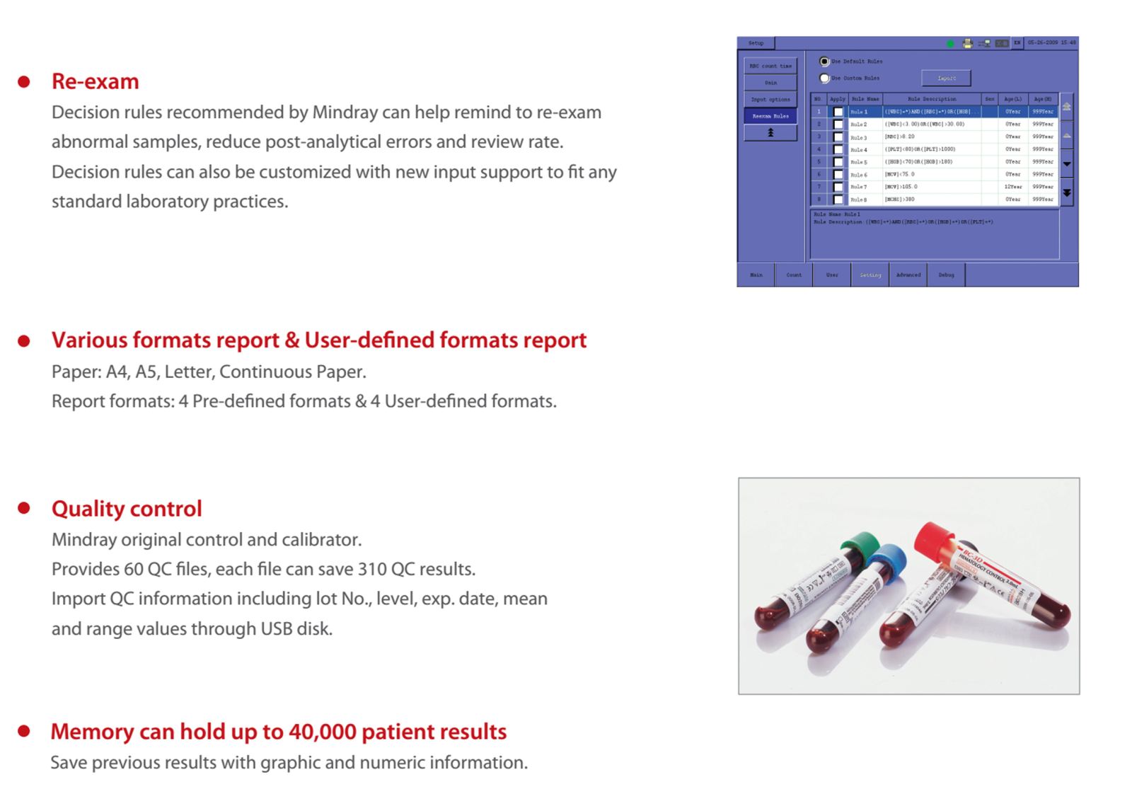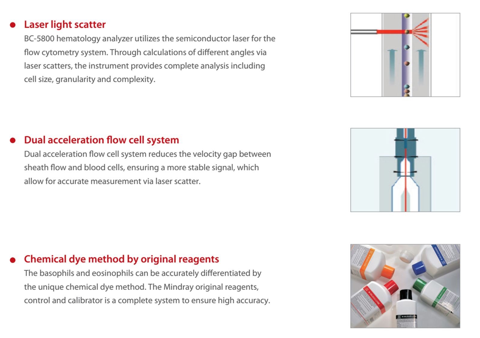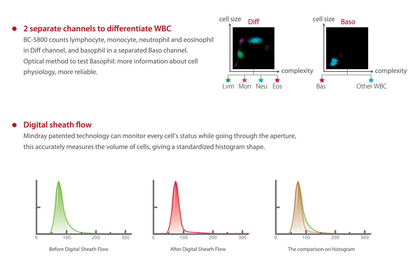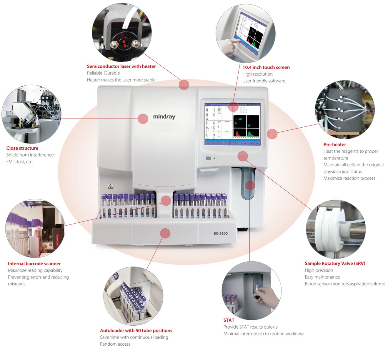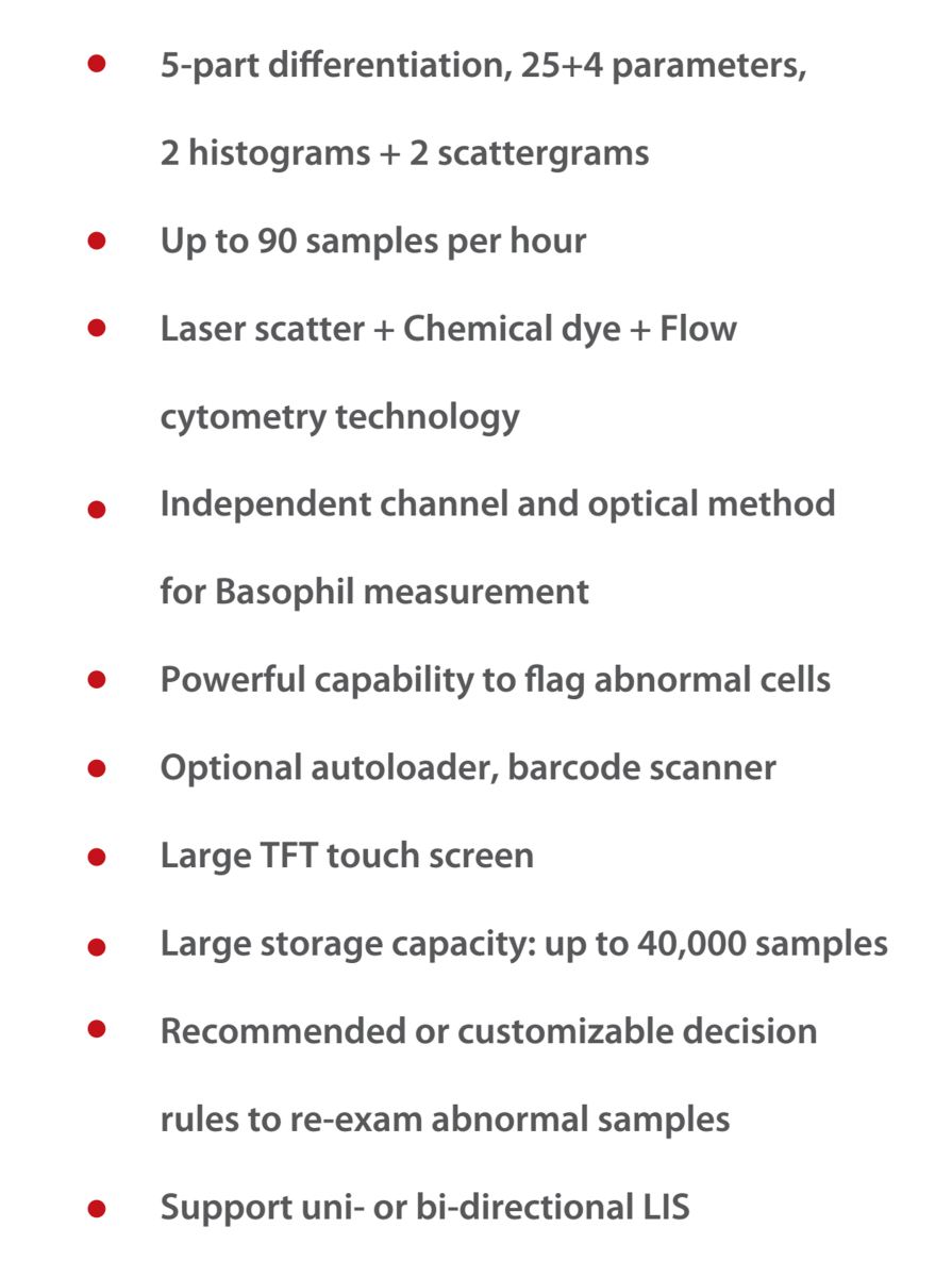 {C}·{C}Phân tích 5 thành phần bạch cầu, 29 thông số, 2 biểu đồ tán xạ và 2 đồ thị {C}·{C}Đếm dòng tế bào tiên tiến bằng công nghệ lase tán xạ kết hợp với phương pháp nhuộm hóa học {C}·{C}2 chế độ đếm: máu toàn phần và pha loãng {C}·{C}Tốc độ phân tích: 90 mẫu/giờ {C}·{C}Máu được phân phối với van shear tăng độ chính xác cao {C}·{C}Đo basophil bằng kênh độc lập {C}·{C}Khả năng cảnh báo tế bào bất thường {C}·{C}Lựa chọn bộ tự động chuyển mẫu, quét mã vạch {C}·{C}Màn hình cảm ứng TFT rộng 2 {C}·{C}Bộ nhớ trong với dung lượng lớn, có thể nhớ được kết quả đo của 40.000 bệnh nhân (bao gồm cả biểu đồ). |