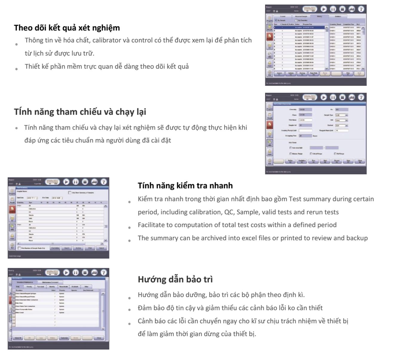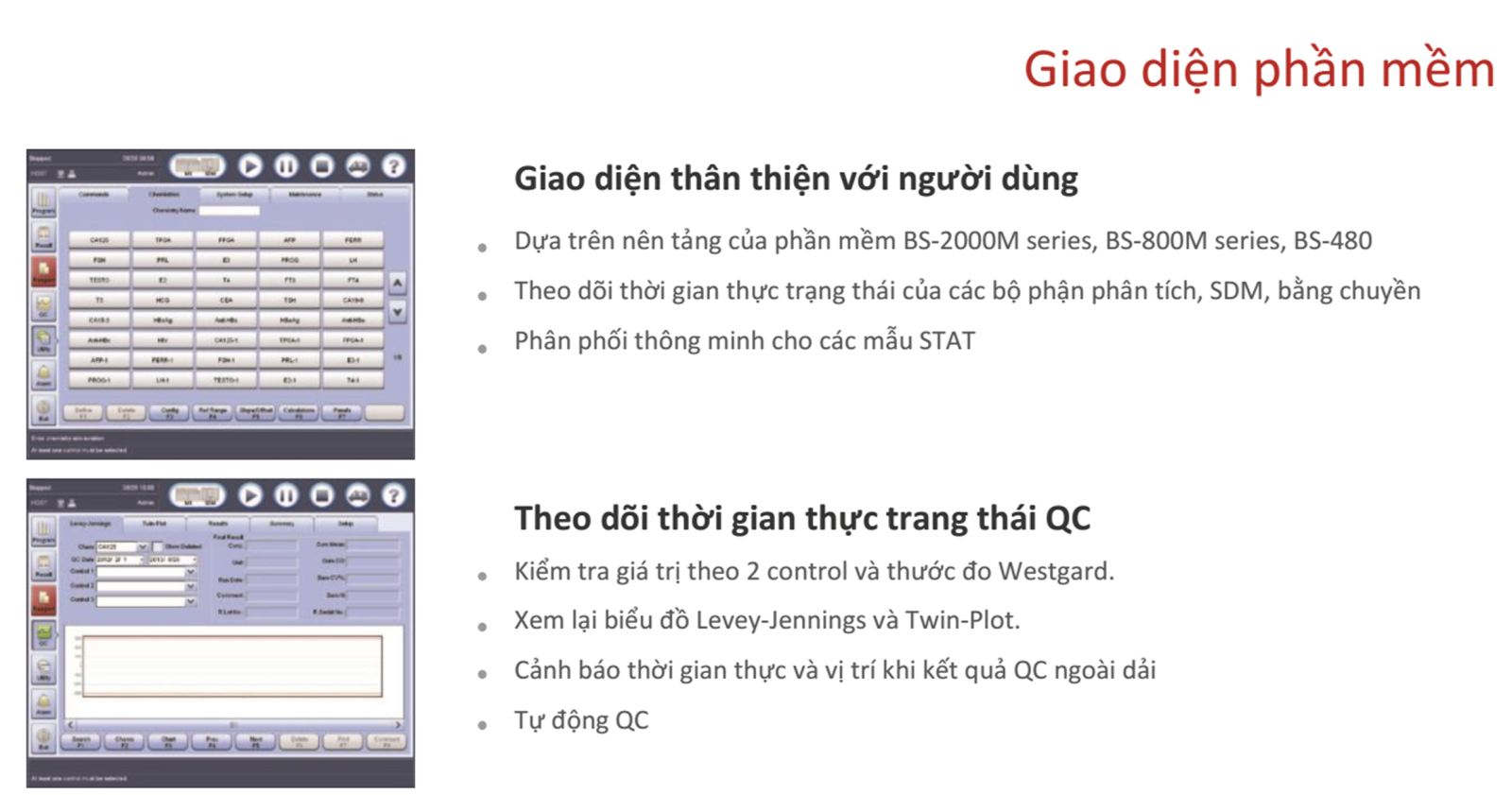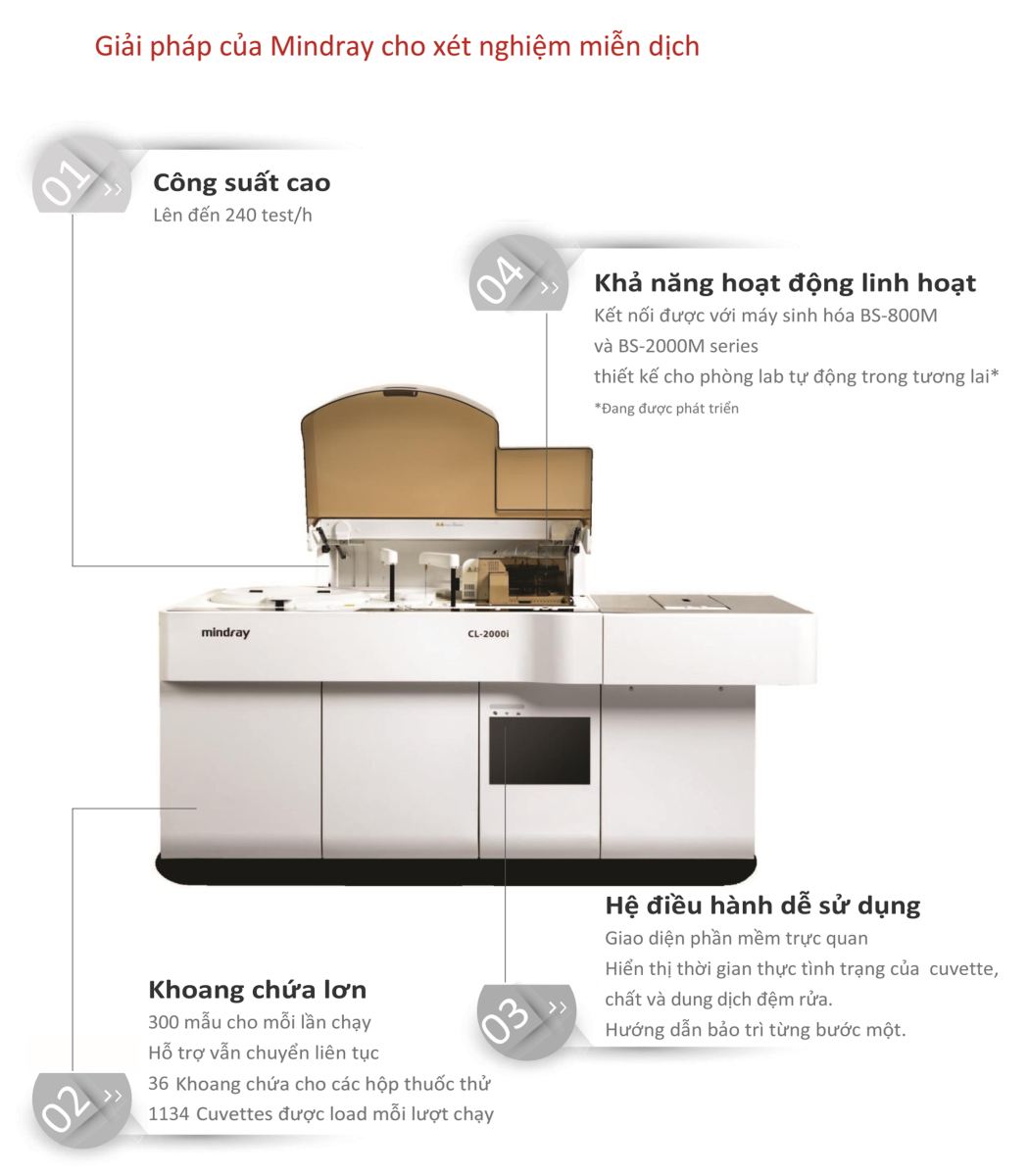 {C}·{C}Công suất máy cao, lên đến 240 test/ giờ {C}·{C}Dung tích chứa mẫu và hóa chất lớn: 300 mẫu/lượt, hỗ trợ nạp liên tục, 1134 cuvet/lượt {C}·{C}Giao diện phần mềm dễ sử dụng {C}·{C}Có thể kết nối với hệ thống xét nghiệm sinh hóa BS-800M và BS-2000M |