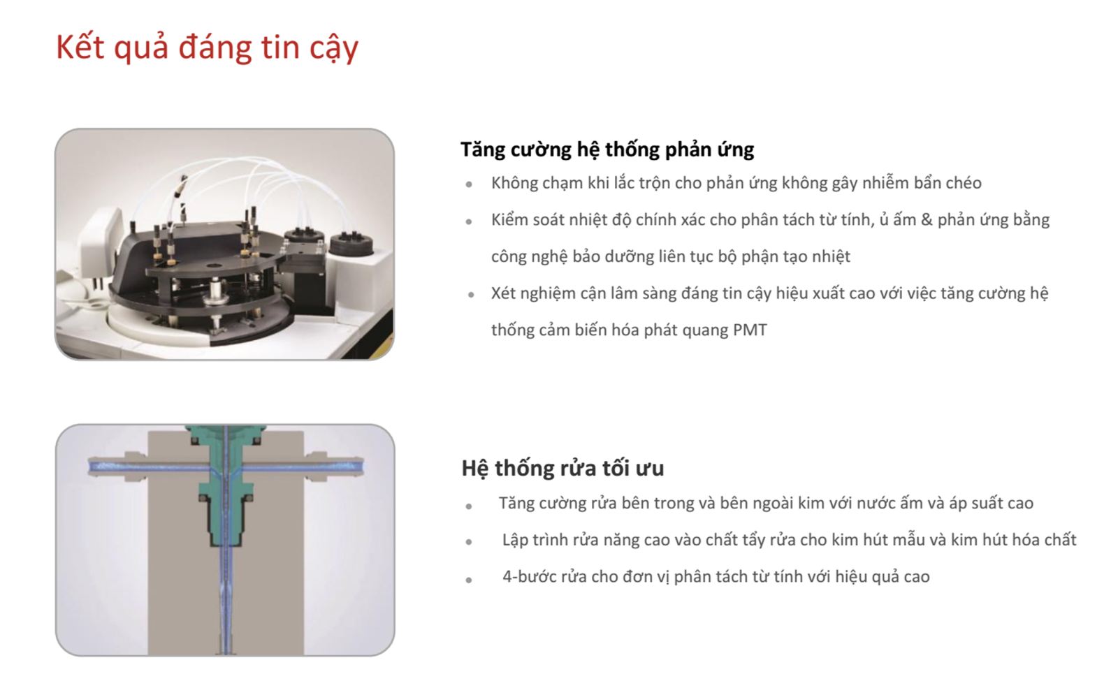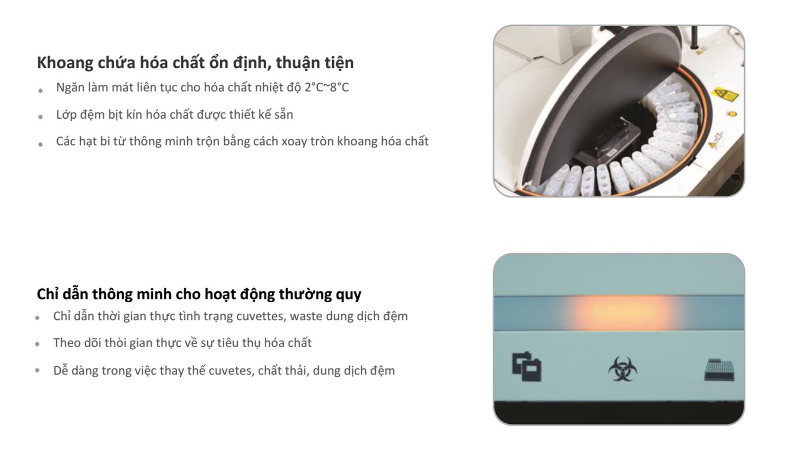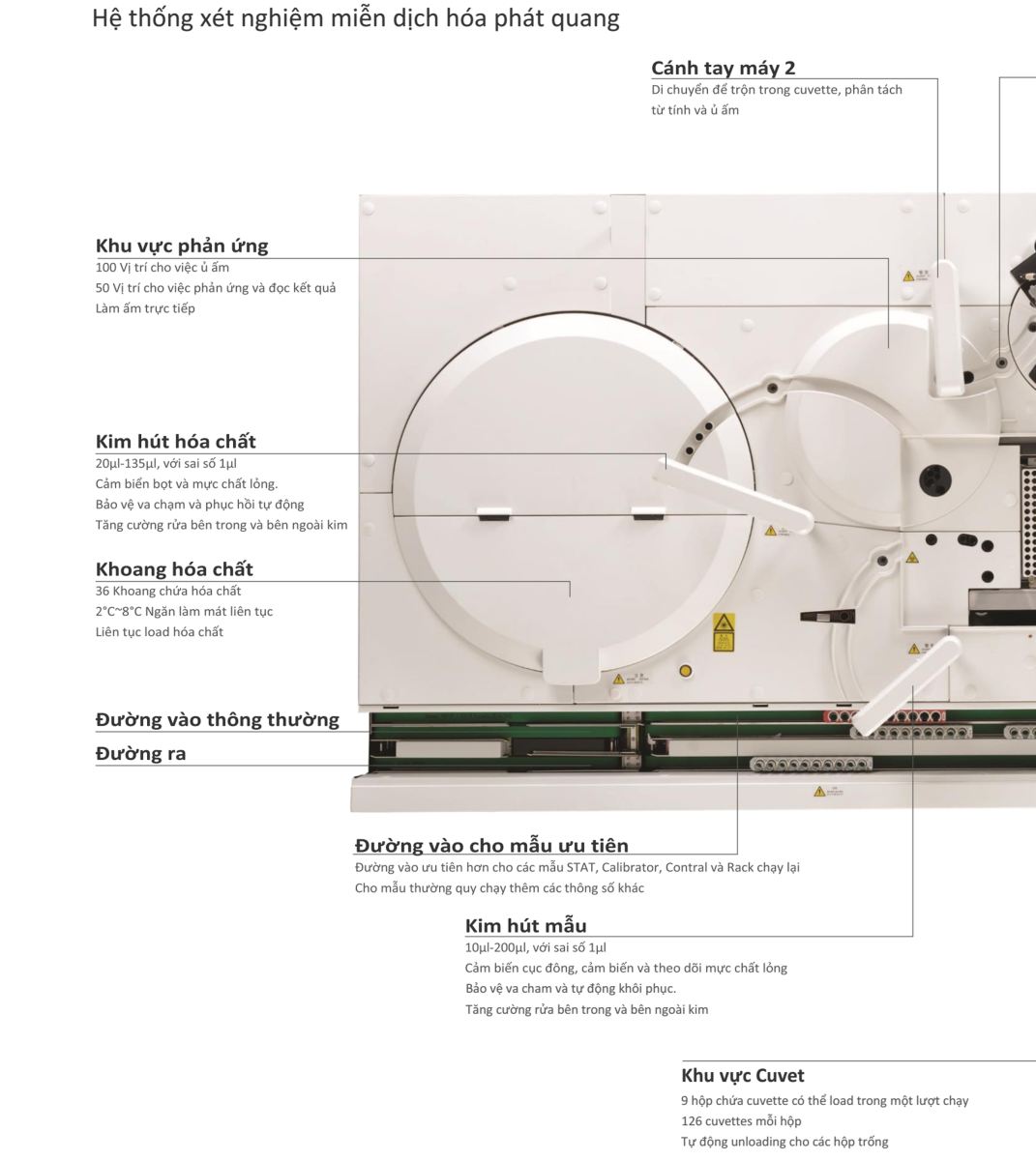 36 vị trí đặt hóa chất, nạp liên tục, trộn thời gian thực với các hạt bi từ |