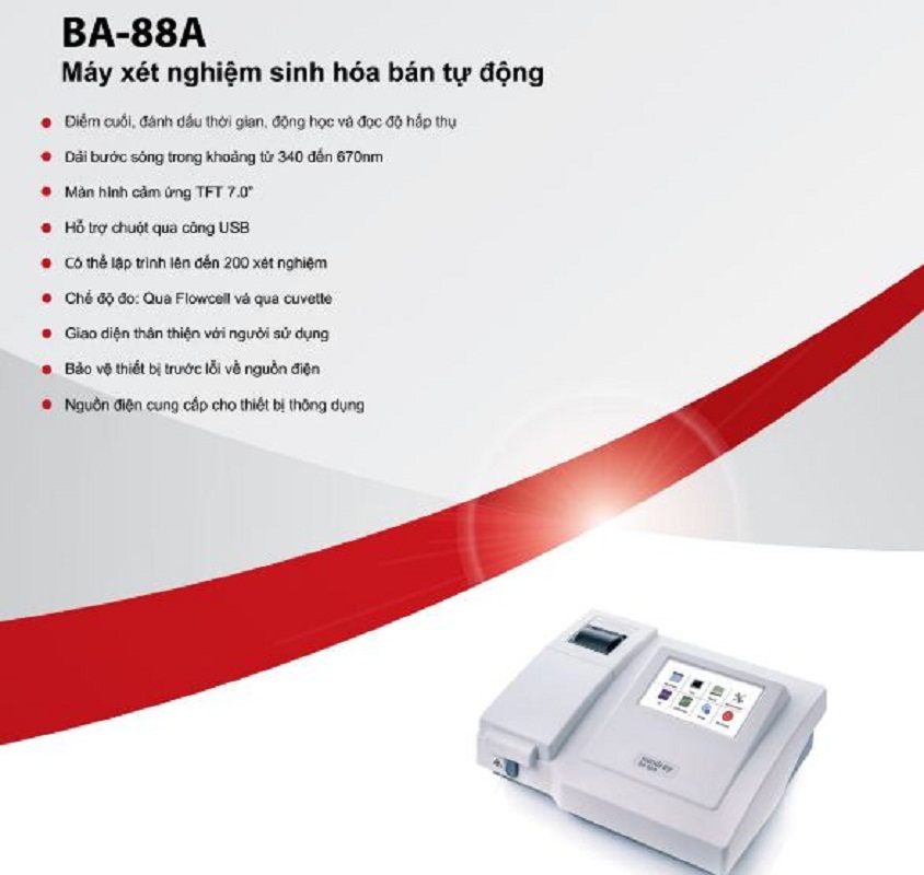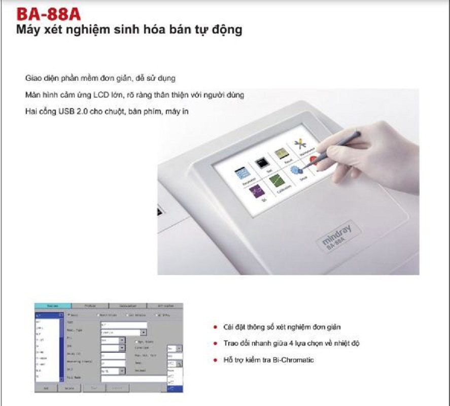 THÔNG SỐ KỸ THUẬT MÁY MODEL : BA-88A HÃNG SẢN XUẤT : MINDRAY – TRUNG QUỐC TIÊU CHUẨN CHẤT LƯỢNG : ISO – 9001; ISO – 13485 ; CE |