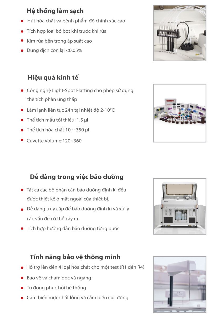 · Khay xoay, 90 cuvet được rửa tự động · Cuvet: Chiều dài quang học 5mm · Thể tích phản ứng: 120~360 µl · Nhiệt độ hoạt động: 37°C · Nhiệt độ chênh lệch: ±0.°C · Hệ thống trộn làm việc độc lập gồm 2 kim |
