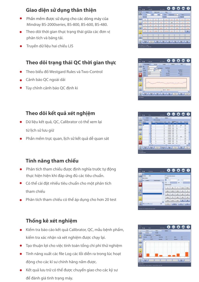 · Chế độ hiệu chỉnh : Tuyến tính (một điểm, hai điểm và đa điểm), Logit – Log 4P, Logit–Log 5P, Spline, Logit-Log 4P, Logit-Log 5P, Spline, Exponential, Polynomial, Parabola · Kiểm chuẩn: Westgard multi-rule, Cumulative sum check, Twin plot |
