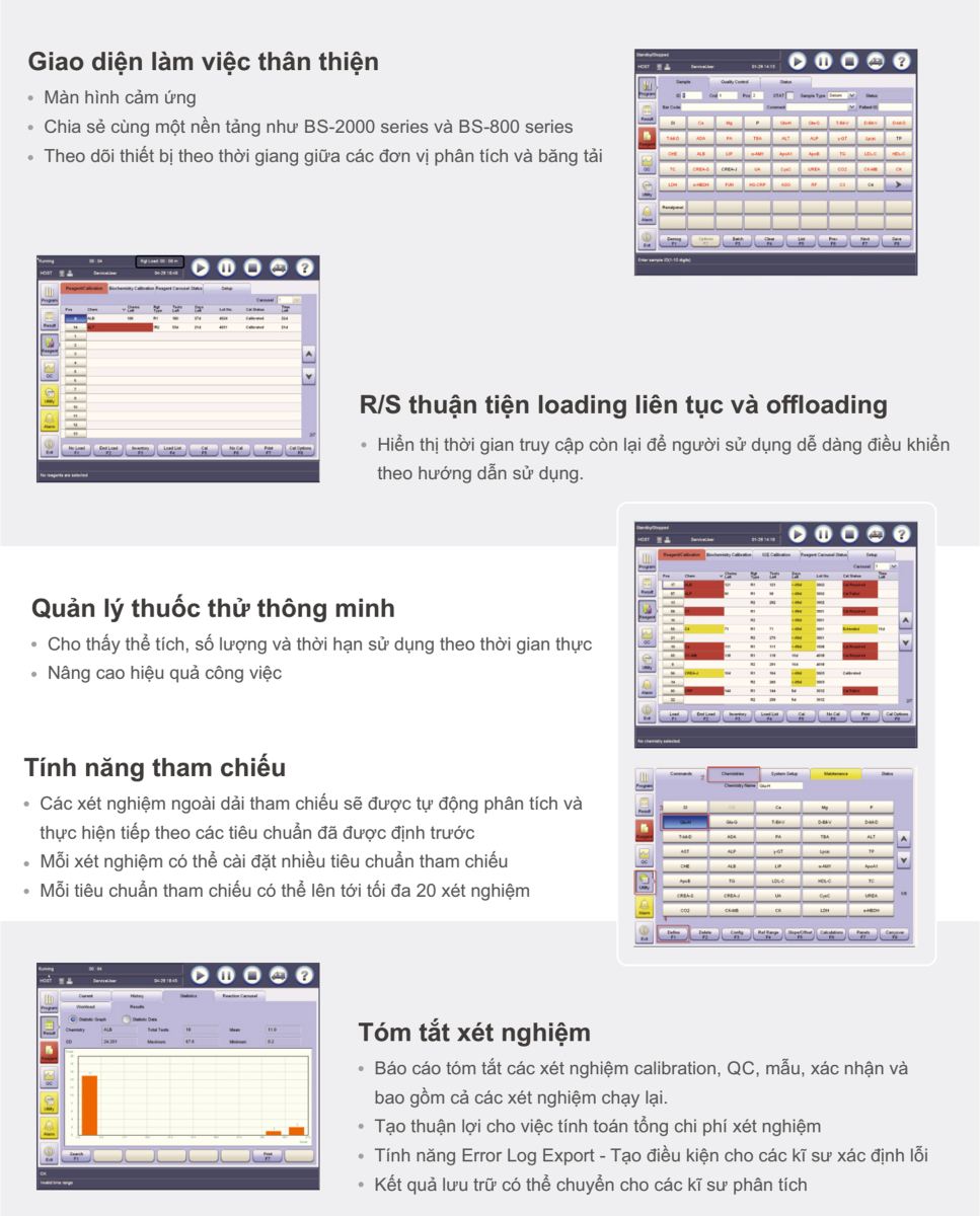 {C}·{C}Hoàn toàn tự động, phân tích riêng biệt, truy cập ngẫu nhiên {C}·{C}Ưu tiên mẫu STAT {C}·{C}Tốc độ: 600 test/ giờ, lên tới 770 test/ giờ với ISE. {C}·{C}Nguyên lý đo: Đo hấp thụ quang học, đo độ đục {C}·{C}Phương pháp đo: {C}- {C}End-point {C}- {C}Fixed-time {C}- {C}Động học {C}- {C}ISE (tùy chọn) {C}- {C}Một/hai/ba/bốn hóa chất từ R1 đến R4 {C}- {C}Một bước sóng/Hai bước sóng {C}- {C}Hiệu chuẩn tuyến tính/phi tuyến tính {C}·{C}Người dùng có thể tự cài đặt chương trình. |