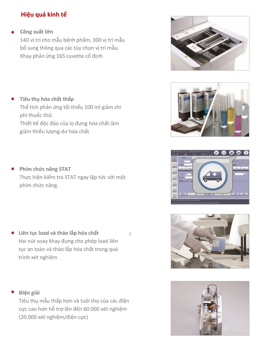 Công suất: {C}·{C}800 test/giờ cho một đơn vị xét nghiệm độc lập của hệ thống modular, 600 tests/giờ cho điện giải. {C}·{C}Từ 800 đến 3200 tests/giờ cho hệ thống modular với các cấu hình kết nối khác nhau, và từ 1200 đến 4800 tets/giờ đối với ISE. |