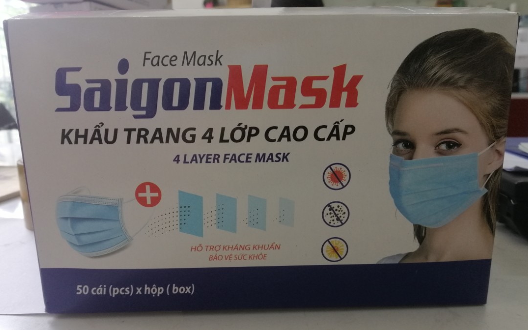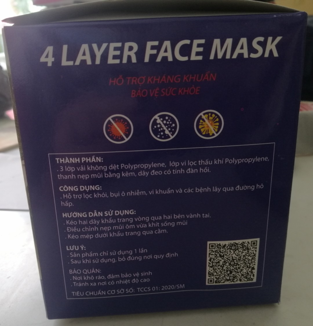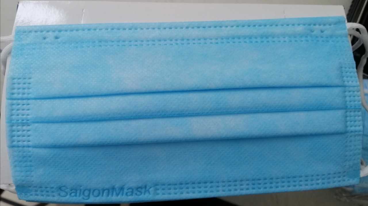 03 lớp vải không dệt Polypropylene, lớp vi lọc thấu khí Polypropylene, thanh nẹp mũi bằng kẽm, dây đeo có tính đàn hồi.